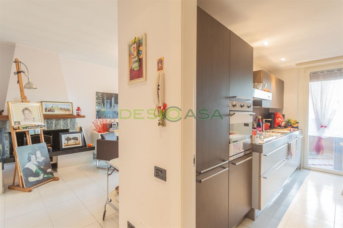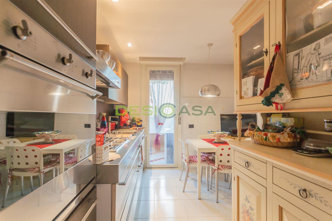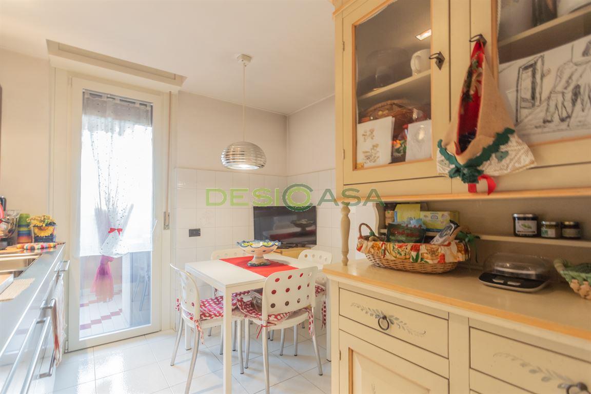 L’appartamento si trova al quarto ed ultimo piano di un elegante e curato contesto condominiale, situato nella tranquilla zona dell’Ospedale di Desio. L’ingresso conduce a un luminoso soggiorno con camino, affiancato da una cucina separata. Un comodo disimpegno introduce la zona notte, composta da tre camere da letto, due bagni finestrati, un pratico ripostiglio e due ampi balconi che offrono una gradevole vista aperta. La proprietà gode di una tripla esposizione (est/sud/nord), che garantisce luce naturale durante tutto l’arco della giornata. È dotata di impianto di riscaldamento autonomo con caldaia a condensazione di nuova installazione, aria condizionata nel soggiorno e nella camera matrimoniale, impianto di antifurto e infissi interni ed esterni recentemente sostituiti. Completano la soluzione una cantina, un box singolo con soppalco e un ulteriore box singolo dotato di piattaforma elevatrice. Libero in 4/5 mesi dal compromesso. La zona è servita da tutti i principali servizi: supermercati, scuole, asili, il mercato nord di Desio e l’Oratorio SS. Pietro e Paolo.